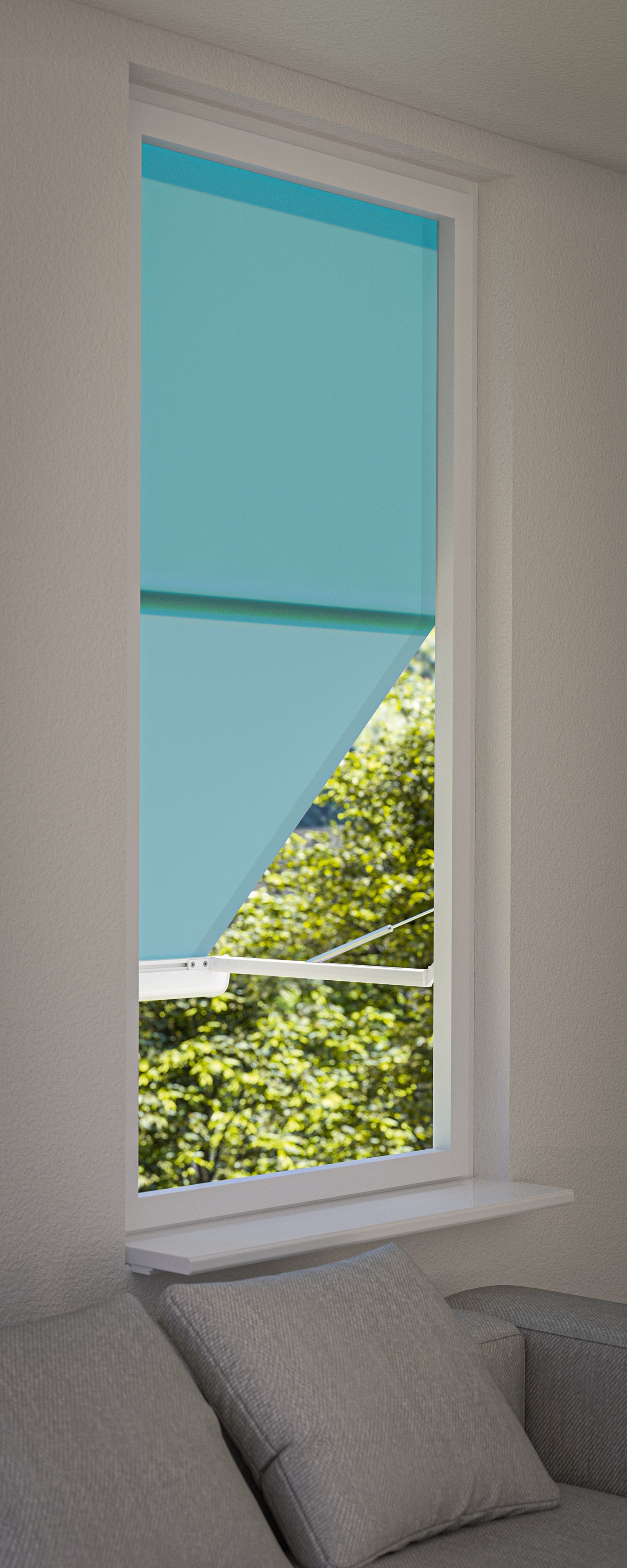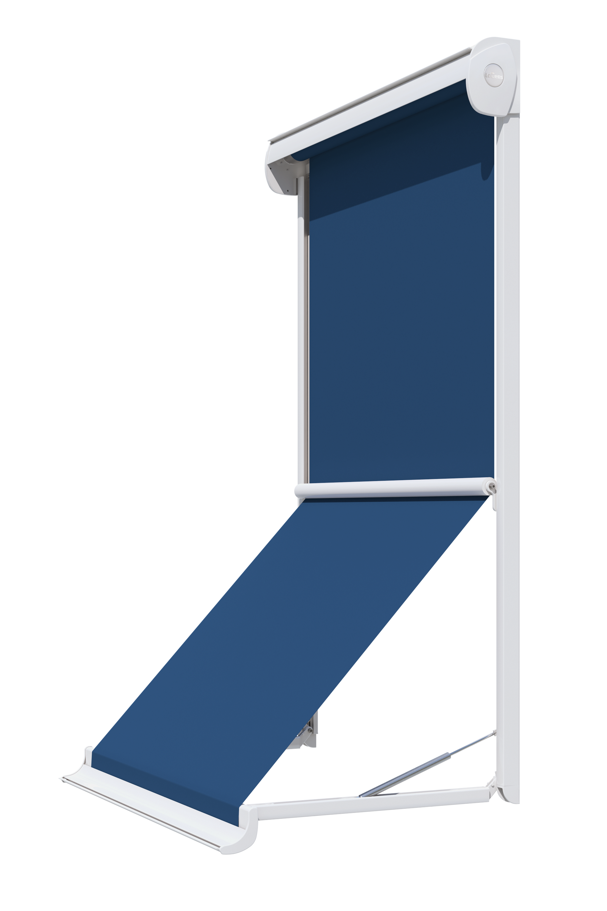 Dit zonnescherm combineert de voordelen van een uitvalscherm met die van een verticale zonwering. Terwijl het bovenste deel altijd verticaal blijft, wordt het onderste deel bij het uitrollen uitgezet, zodat het zicht naar buiten vrij blijft.