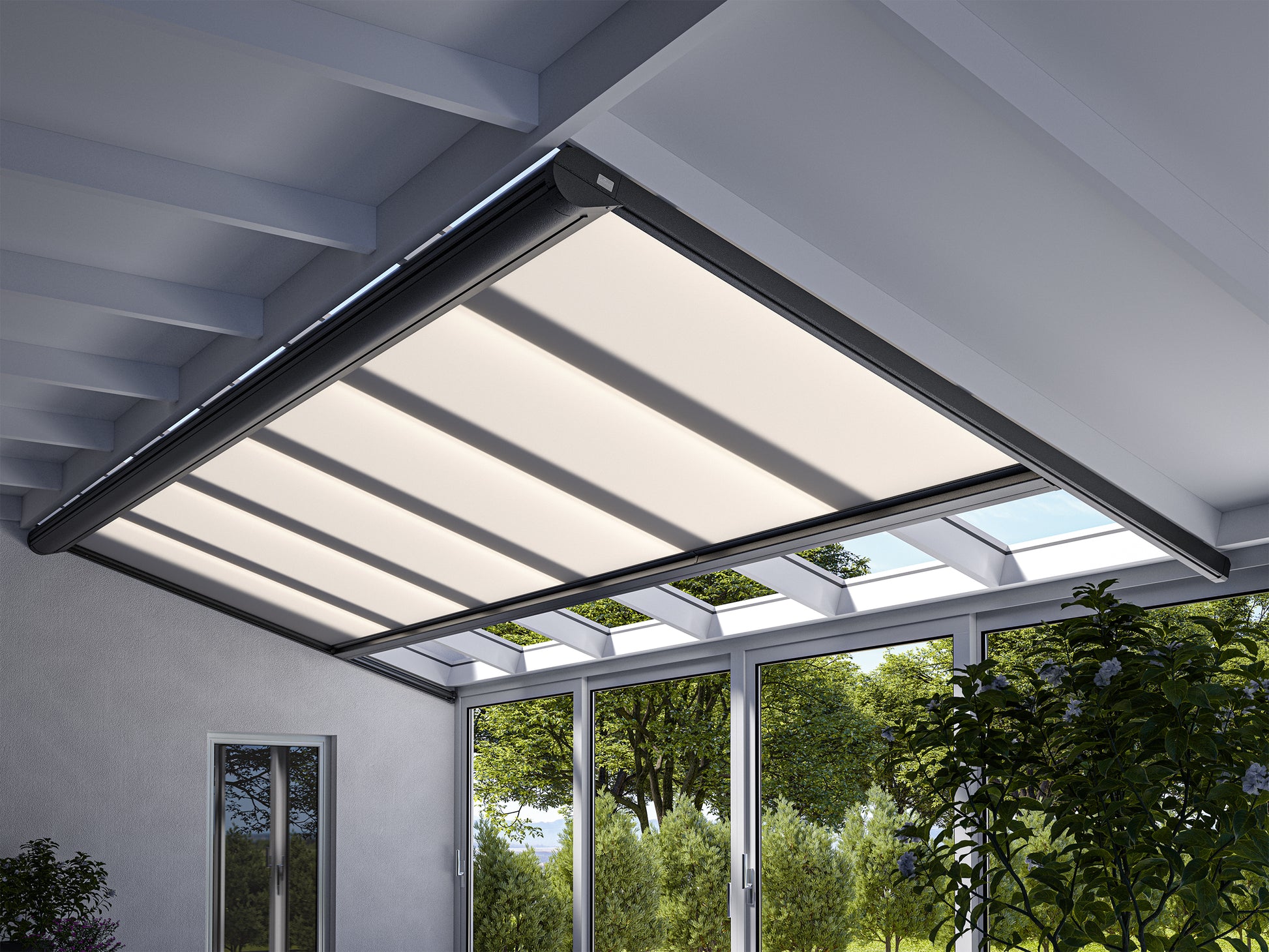 De onderdakzonwering Portofino biedt bij glazen daken en veranda’s perfecte bescherming tegen de zon, naadloos en zonder storende lichtspleten aan de zijkant. De gesloten zipgeleiding met gepatenteerde compensatieveerspanning zorgt ervoor dat het zonneschermdoek altijd mooi strak zit.Opties zoals een draadloze afstandsbediening en in de behuizing geïntegreerde LED-verlichting zorgen voor extra comfort en nog meer gezelligheid.