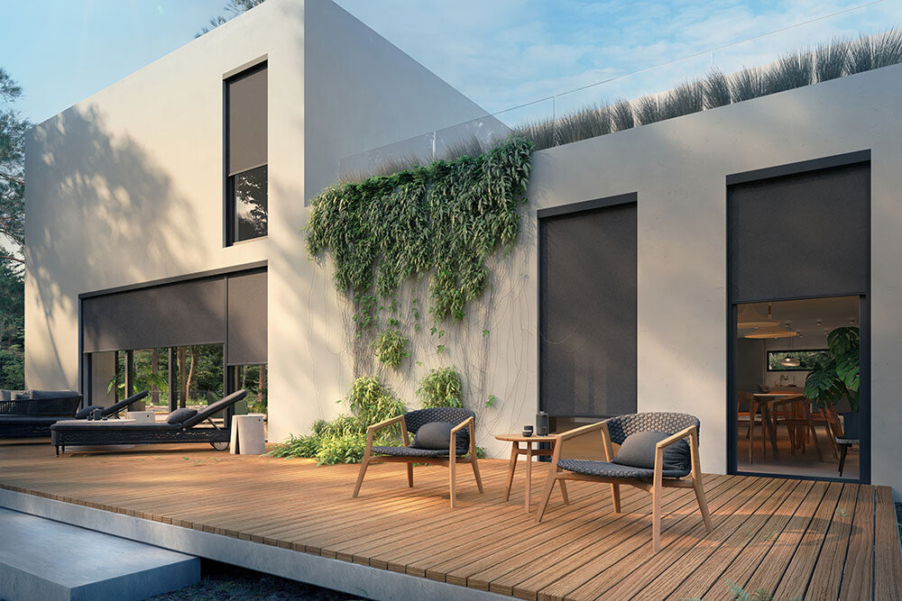 oor wie op zoek is naar comfort en slimme bediening, bieden wij screens met IO-motoren van Somfy – dé referentie op het gebied van elektrische zonwering.